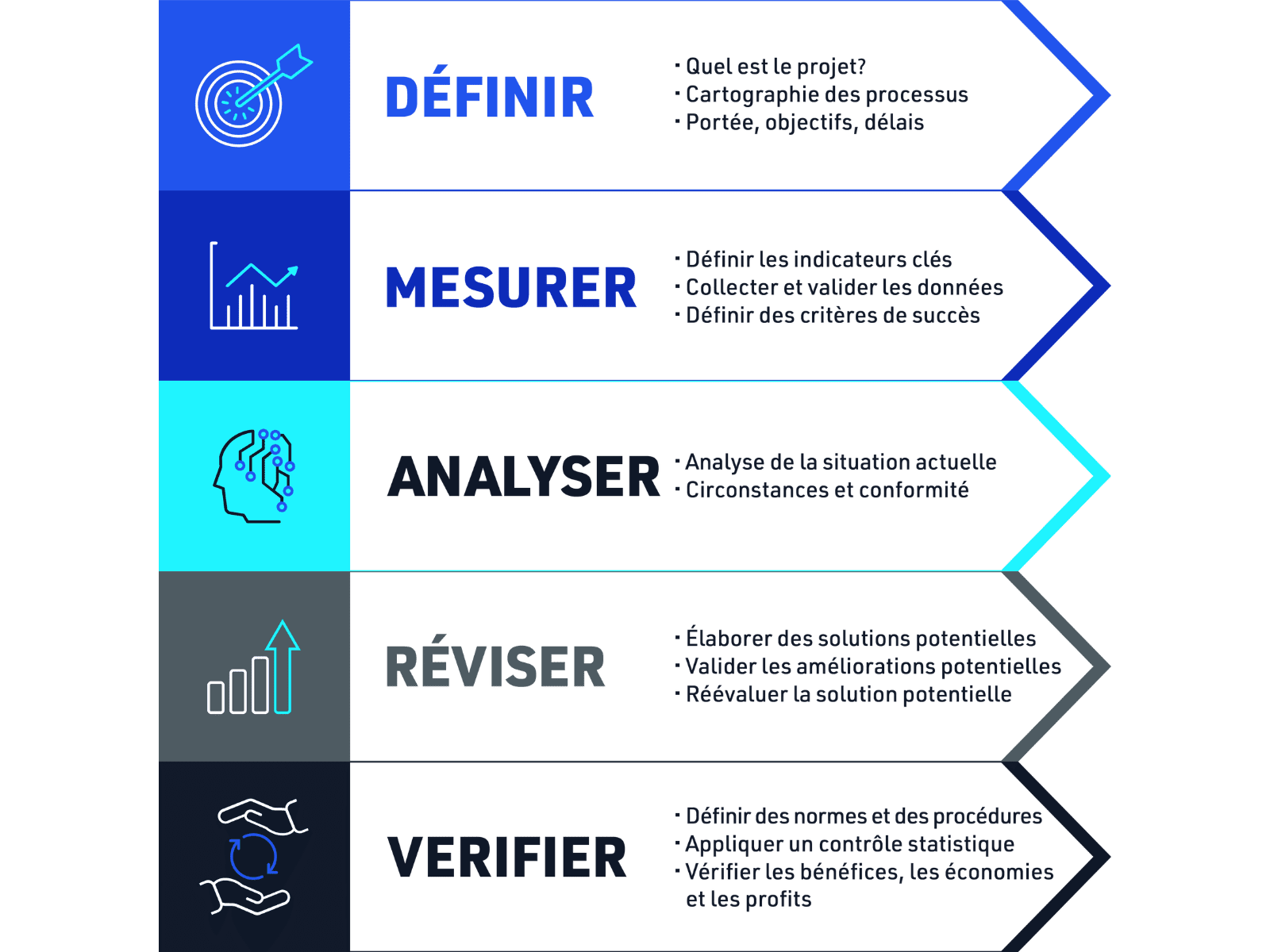 Les grands axes que nous utilisons avec Six Sigma sont : Définir, Mesurer, Analyser, Améliorer et Contrôler (DMAIC). Il s’agit d’une stratégie qualité basée sur les données et utilisée pour améliorer les processus.